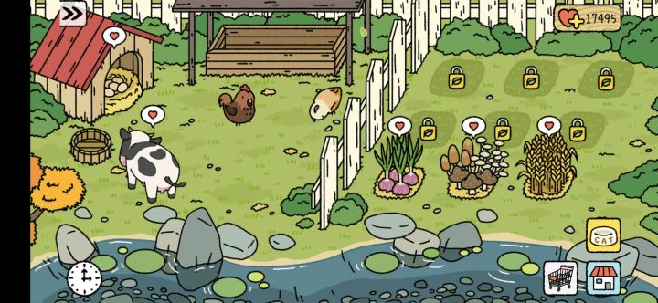 P1 早上一去就看到农场很多小爱心 看到很多植物成熟 很有成就感 很有爱P2 吃自己做的菜 带劲儿!(看起来好好吃 我都馋了)P3 晚上发现熊熊坐在跷跷板上!P4 小猫咪在周围玩耍 俩人在床上看平板特有爱P5 雪球小可爱多进了盒子里 可爱!P6 因为地太小了嘛?小猫咪们都横着吃饭?P7——P9全是自己做的食物 太满足了!!!😻