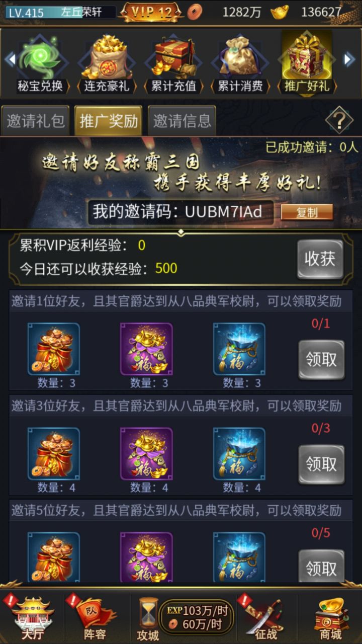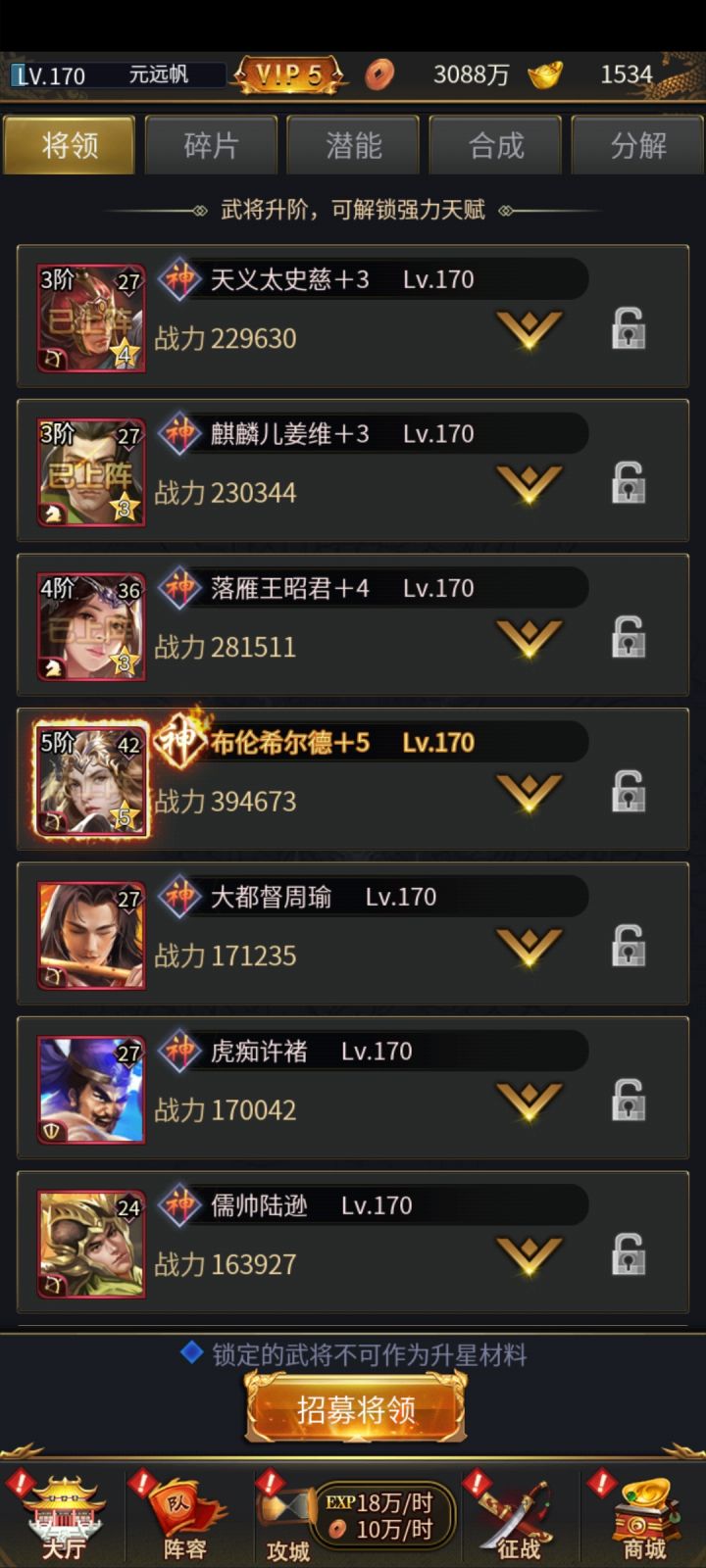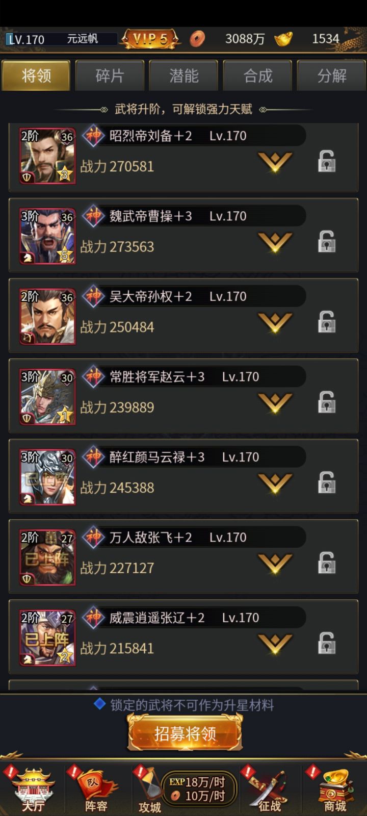 主要针对白嫖党和小R 元宝多到用不完的土豪略过。。。首先要做的就是刷副本升级 刷不动了把挂机次数买完 演武和其他长经验的刷完最后再点直接升一级 这样经验多一点再说怎么搭配阵容 橙将紫将都是过度将 两天就换了不提 神将前期主升哪几个 许褚典韦魏武帝曹操刘备孙权 主升曹操 各种资源升阶丹融合丹只养曹操 只养一队 直到招到韩信吕雉刘邦刘秀元宝幸运币能省则省 多攒一点可以用聚宝盆升值突破丹尽量不要