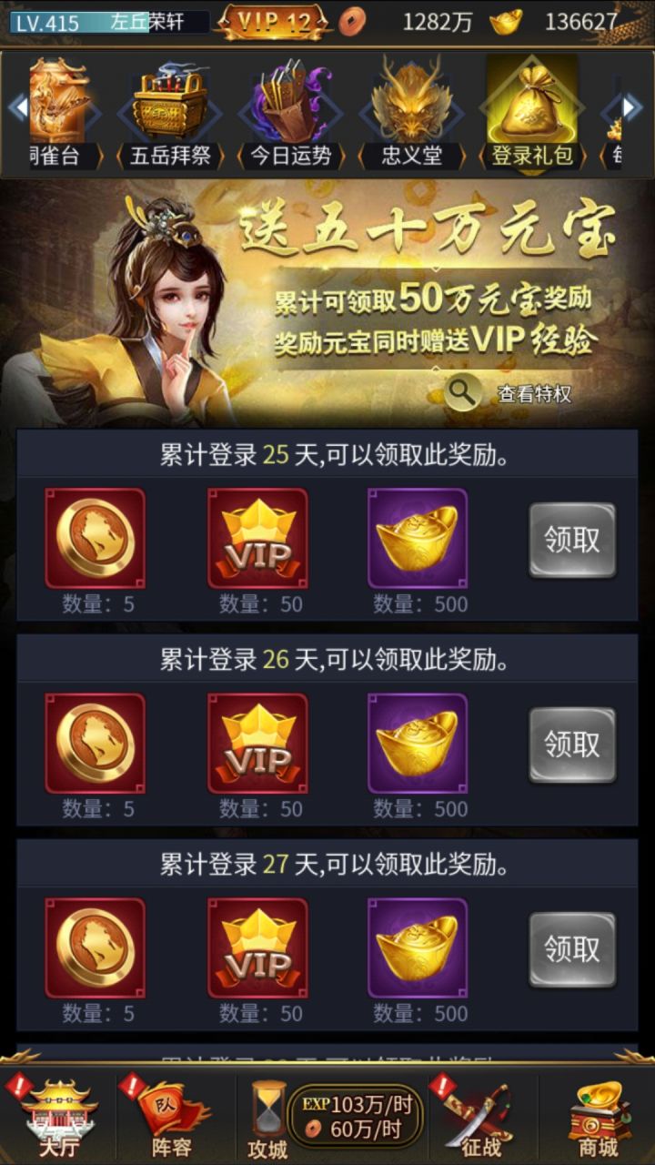 大厅里的密信和断案,每天最多累计8次,可以获得道具子民,元宝等,奏章每天最多累计三次,可获得大量子民,如果运气好可能会激发双倍奖励哟~活动介绍青梅煮酒:每天两次(中午10点-14点,下午18点-22点),每次可以获得2枚幸运币五岳祭拜:每日一次,获得大量经验且必升一级,每两天祭拜还可以获得甲级宝物。(前期所有活动做完的时候以及关卡卡主的时候再点,因为能够直接升一级)今日运势:每日一次,获