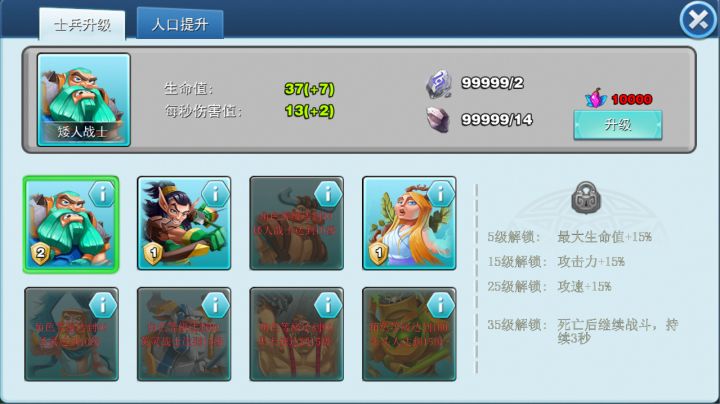士兵系统介绍士兵简介作战中除了派遣神将外,还可以组建士兵部队进行战斗。士兵可以分散敌方的输出火力,诱导对方进攻,为神将拉开发挥的空间。兵种解锁玩家可掌握的兵种数量,将随着玩家等级以及前置兵种的等级逐步开放。具体如下:矮人战士:初始即开放;精灵弓手:玩家等级达到10级;英灵战士:玩家等级达到40级,矮人战士达到10级;圣灵:玩家等级达到50级;炽天使:玩家等级达到60级,圣灵达到1