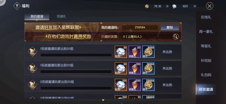 DWXKFQD升到15级左右点福利往下拉,找到好友邀请,点第二个页输入邀请码确定;就能领些前期还算有用的东西,领吧吧送的。