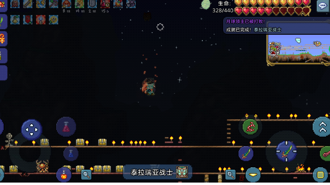 准备要打石巨人时看别人打挺轻松,当我真的进入时才知道,我的丛林神庙地形十分奇特是个直角梯形 ,用翅膀的打几次被捶死了。地形太小容错率变低了,要多硬扛几次准备蠕虫围巾、冰冻护盾和乌龟套来减伤,混乱之脑、忍者大师装备来闪避。最上三格搭个平台用克苏鲁护盾无敌冲刺,可直接让水陆两用靴飞速奔跑躲拳头激光,但我的操作依然惨不忍睹,残血到第二阶段还是被射死。用忍者大师装备的猛冲(冲的比较远但没有无敌)和神话护身符的减红药冷却时间来半血到二阶段。之前的高平台是让石巨人的头撞不到我,但到二阶段飞行的头射激光比较准,只能再搭建一个石巨人二阶段上不来的平台来躲激光。用吸血飞刀打十分轻松,肉后可刷猩红环境怪可掉落猩红钥匙,去猩红地图打过世纪之花才可从神庙中打开猩红宝箱中有,我的是腐化世界,从多人模式中拿到还是比较轻松的。