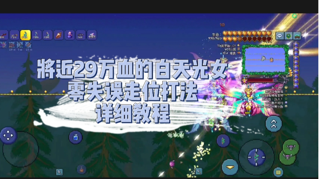 这是本人以各种办法打了上千次白光,从中总结出的一套失误较少,上手简单的一套白光打法,适用于所有阶段的白天光女,视频内演示为目前手机上最高难度的Ftw289000滴血的白天光女。 一些比较重点的文字描述可以自行暂停截图。 学会此套打法,三王前的装备也可以击杀光女(前提是你有那个耐心😜) 比较难的一点就是场地,实在懒得话,推荐去找一层平台的打法,此套打法场地位于地表100左右,平台数量可多可少,至少不低于七层,平台间隔60格或120格左右。(肝得了的话光女难度会大大下降,肝不了的话,那就该咋打咋打吧😂) 装备增益后面有,这里就不过多描述了 最后祝各位泰拉的萌新们,越过白天光女这道大坎(😎)