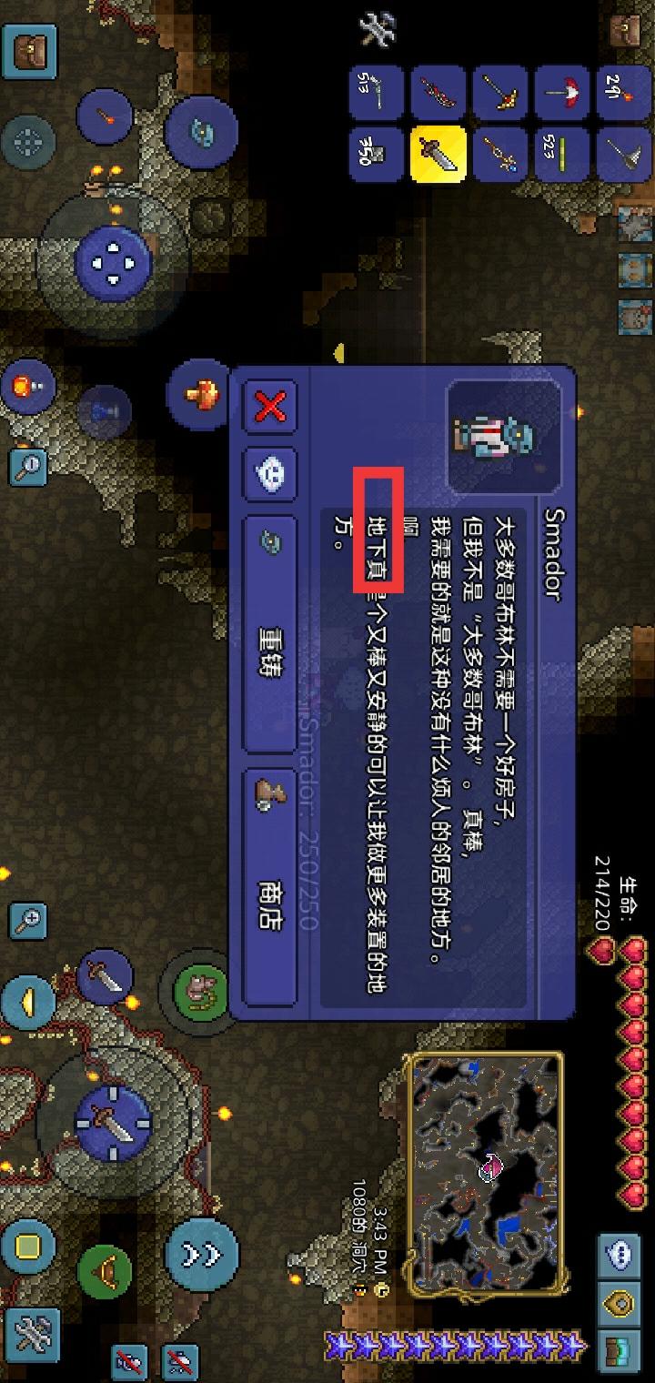 这家伙终于被我找到了,之前打了一次哥布林入侵,刚在地下发现被捆绑的,结果被骷髅三下给弄死了,然后就怎么找也找不到,听一个朋友说先建一个房子,才会刷新,果然。 找他马上买了一个工匠作坊,把这三个东西合成了1全球定位系统2鲨鱼龙气球3幽灵靴子 ( 省了三个格子) 听说他喜欢住地下,就让他和爆破商人一起住吧。(给作者点个赞并关注吧😎😎)