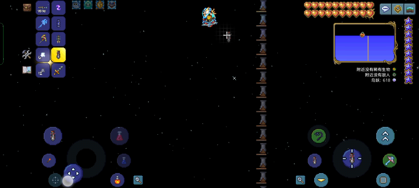 众所周知👂,在太空可以降低boss的攻击速度🗣,那么就用手在太空刨一个房👀,再种点向日葵🌼(好像没啥用)顺便再搞来一个护士🧕,打的时候一直开治疗界面,妈妈再也不用担心我掉血了👩👍。 装备的话,选英灵殿塔防流,再搞几个水晶就很奈斯👌,饰品选攻击和免伤,武器天顶,除了用治疗和攻击其他根本不用动🤟 基本上boss都通用(月总等)