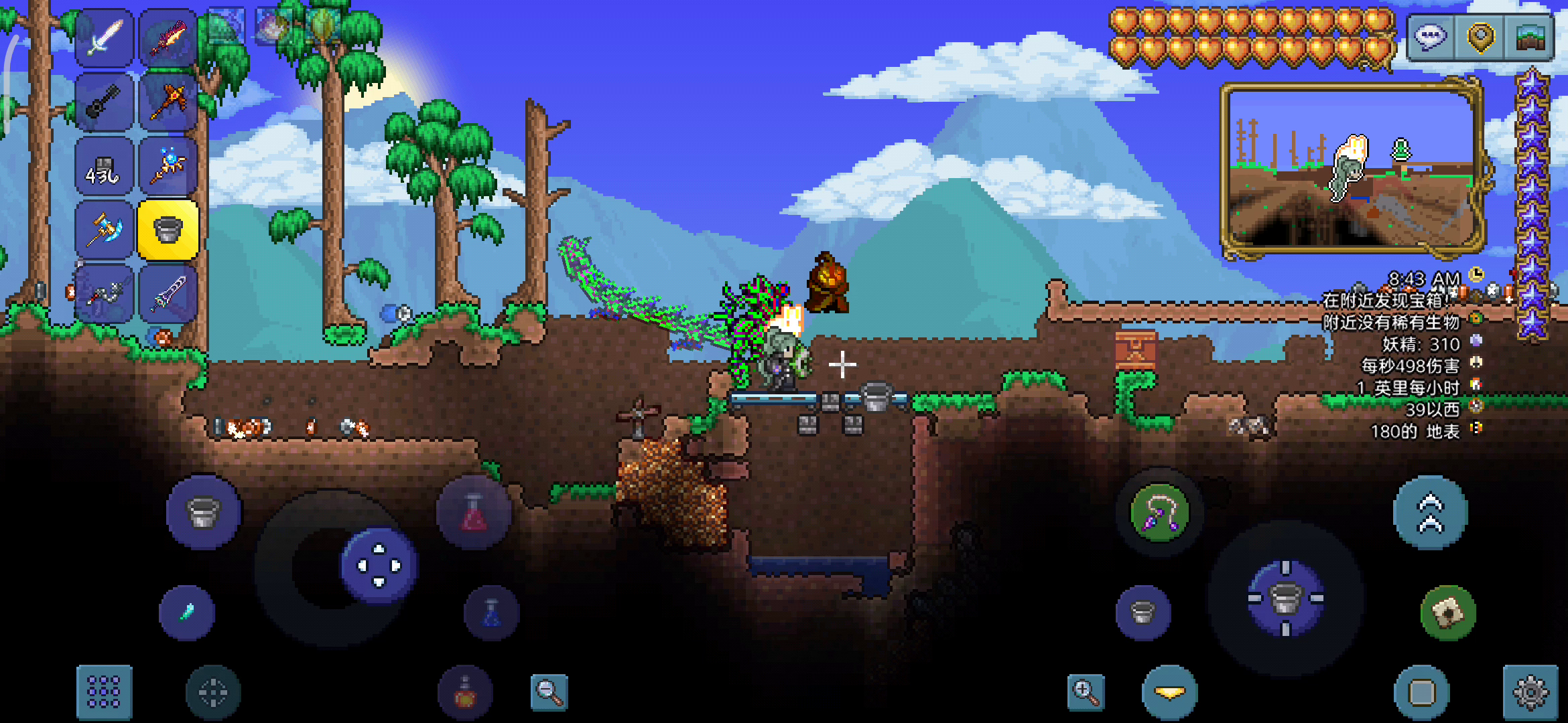 经过长期的拖更,一位粉丝一个多月前已经催更,终于在五一节假日抽了时间录了本期视频。 看了上一期视频的进度(因为连我都忘记上次玩到哪里了),本期视频主要任务是等待丛林草丛蔓延,同时顺便打打史莱姆和怪,闲暇时间挖一下草堆(捕捉昆虫为后期钓鱼做准备),本期视频后我发现因为之前还没凑够30个铁(也就是10个铁锭,3个铁锭做铁桶,7个铁锭做钓竿)就把商人招回来,导致现在刷怪慢了,刷铁的速度就会慢,不过没关系,我计划接下来等待丛林地形长树后在更低的地方再建一个刷怪场!