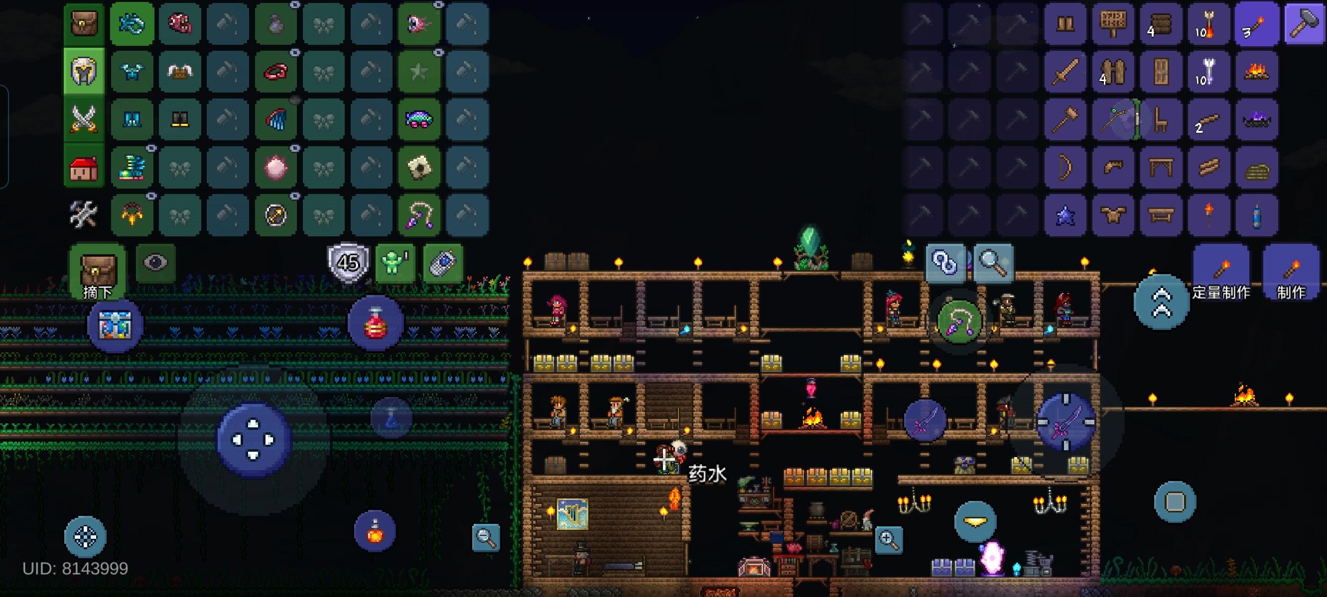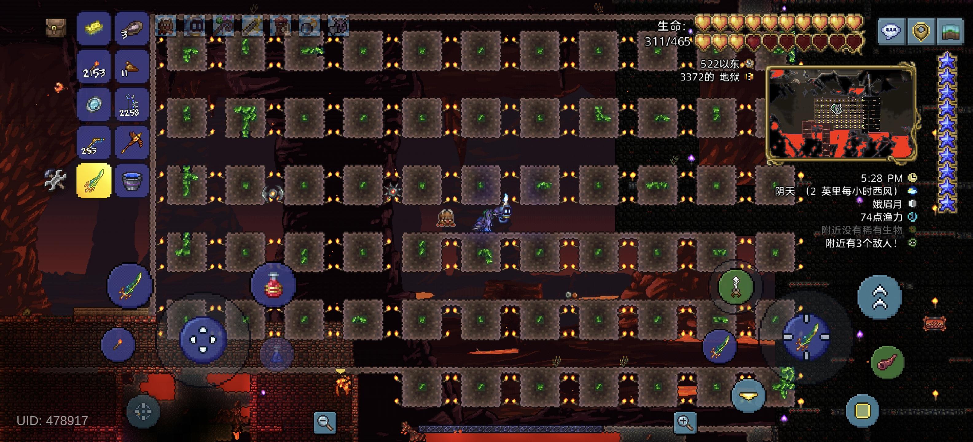 先说一点游玩经过新手的第一张图,虽然是个中世界,总有点不舍得被蔓延,拿到鼠鼠车,就想着多探索,一直没打肉做了全套狱石甲和工具,小鬼杖,(之前老喜欢陨石套装了,攻速快,又避免站桩被干扰)不怕小怪偷袭,慢慢挖出了六百格矩阵,毕竟地狱线大概2400。最难的就是卡进去蜥蜴那里,被舔一下就半血,马上回家把看着有用的药水各做了五十瓶,剩余草药都在500以上。后来查了boss总略,半夜给我笑的睡不着,打