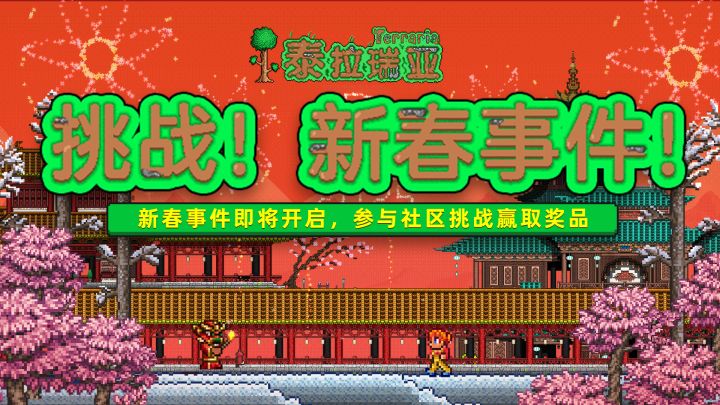 每当农历春节到来,一个红色身影也逐渐靠近泰拉瑞亚大陆。名为新年龙的春节“吉祥物”盘踞于天空,而泰拉居民们也将完成新年试炼,获取节日的馈赠——挑战:新春事件!在1月22日-2月9日间,游戏的新年事件已经可以触发,击败新年龙,并将战斗过程的视频发在论坛里面,带上#泰拉瑞亚 的话题,就可以参与此次挑战活动。*新年龙需在击败肉山后,于太空邂逅。挑战掉落物:新春宝物袋:除了击败小白龙获取的宝物袋之