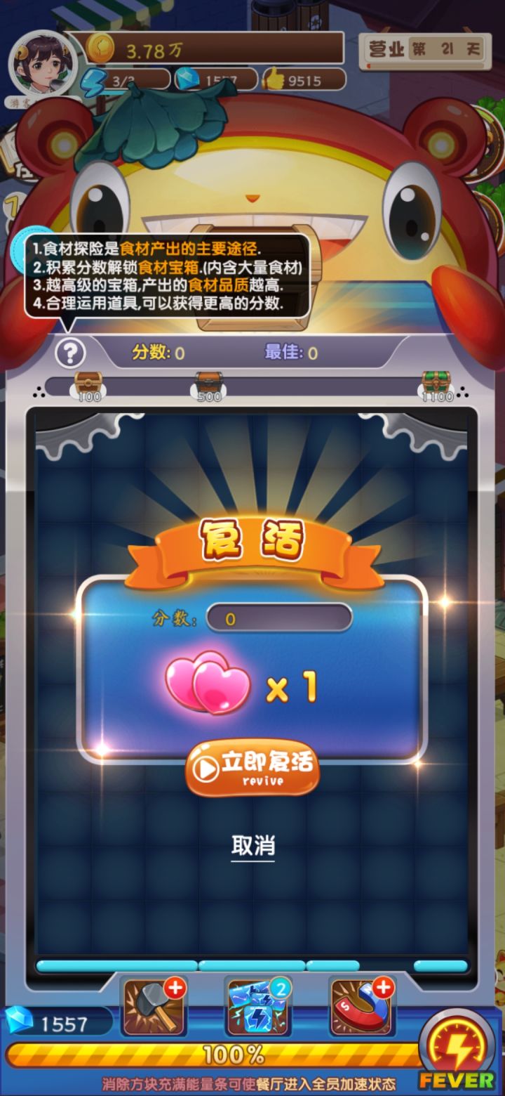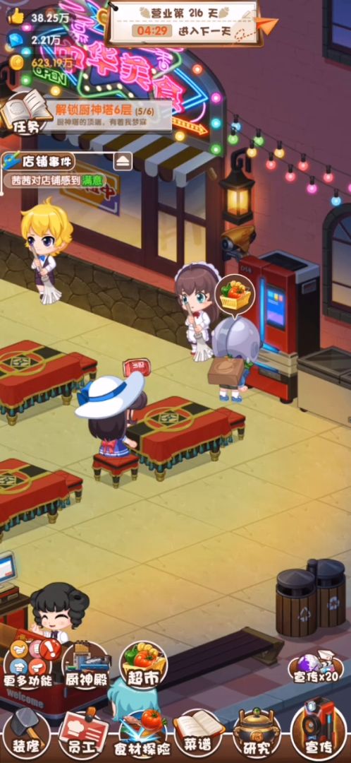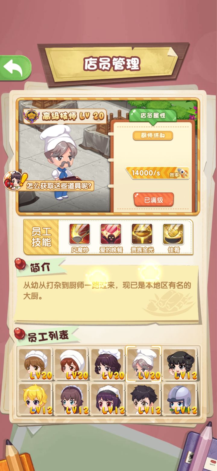1:钻石只能开箱子用,但是开箱子的小游戏只有一个,玩几把就玩腻了,建议再增加几个小游戏,或者设计一个钻石商店,可以买一些道具。2:员工已经全升到了高级技师,传说级的道具攒了一堆没法用了,增加一个可回收或者可兑换成其他道具。3:餐桌升到顶了,员工等级也到顶了,赚那么多金币就只能买食材?是不是可玩性已经到头了?该养老了?4:这游戏没法追求全五星变色,因为五星变色难度太大了,一个步骤出错就会前功尽