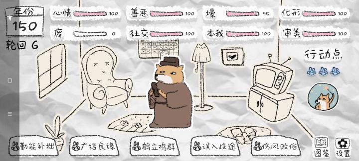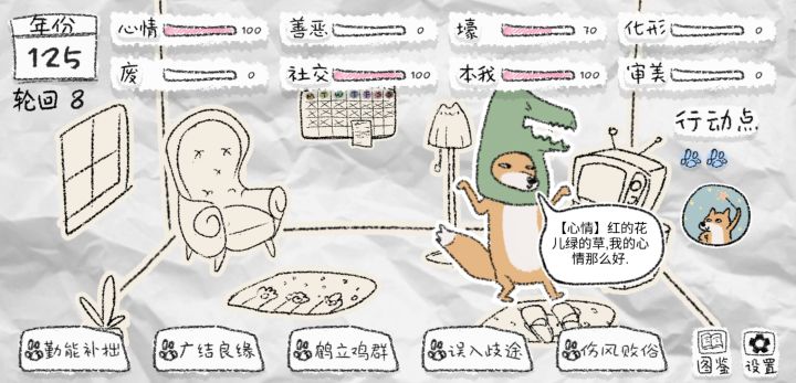 图鉴全部解锁啦!!第一轮回没有基础点,所以很容易达成第一结局。影响修仙走向主要就是废,废≥55向上走,废<55向下走。化形好像没什么作用,我化形100也能达成第一结局。而且小狐狸真的又贱又可爱哈哈哈哈哈