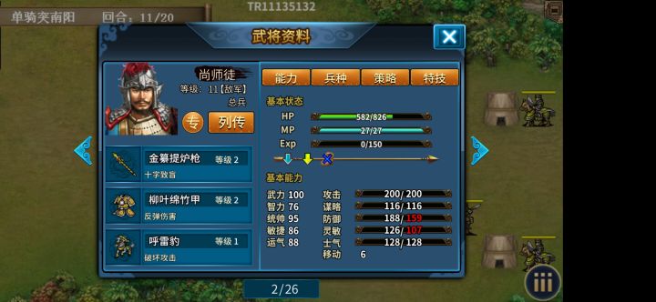 第二难度,特殊任务不好完成,这关读档试了一个小时左右,终于完成了,奖励不错,武云召五维全加5柴绍打酱油,武云召单干,主动攻击只打步弓和法师,其它兵种包括弓骑全能反死速灭尚司徒,这货的致盲太烦人,先引到兵营附近被动反二刀,下回合不能攻击正好跑开嗑个物理果加buff,再回合主动双击且SL反击格挡或者buff不掉,被动回合一定要反死他,伤害有浮动需要SL12回合韩擒虎出现,一定要优先耗光他蓝其它