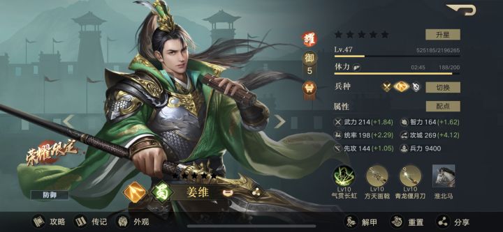 各位看官老爷子好!这是楼主发布的第二个帖子,希望各位大佬能点个赞今天来给大家说一说姜维姜维的四维面板还是不错的,配合上自带技能能扛能输出,开场的增伤与减伤都极大增强了姜维自身的属性这边本人自己配的一队并没有很高的爆发,但是也十分的肉,这个队伍配合上姜维形成一个能扛能输出能回血的阵容,没有太大的天敌,唯一打不过的是对面的青梅吕布四保一阵容,仅仅凭借这一队直接让我在前期拿下战功榜前10我们来