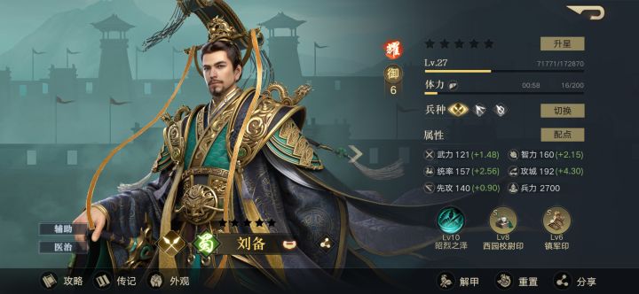 各位看官老爷子大家好,新人初来乍到,希望大家多多支持。我对这个游戏研究比较深,之前有玩过3年的率土,玩过1年的三战,对此类游戏还是比较情有独钟的,给大家介绍一下刘备这个武将1.刘备是个非常万精油的武将,他不仅能组合桃园,还能组三保一、吕布弓等,在于他的强力自带回复强力技能 2.无论是组任何队伍都是数一数二的强力T0、T1阵容,每6s回复200%的兵力,溢出的治疗将转换为护盾并且50%概率免疫控