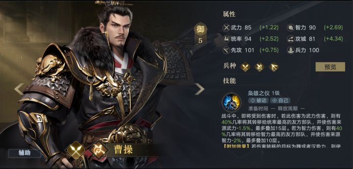 夏侯惇张辽四骑主要成员为夏侯惇、张辽、曹操、曹丕,主要优点是带上夏侯惇张辽这两个单刷英雄,又肉又有伤害,而且伤害还是隔山打牛跟群吕一样先杀后排,夏侯惇张辽技能都是开场和被动,也不怕控制,非常值得推荐。装备如下:夏侯惇铁卫重铠嗜血刀张辽塘上行义丛弓、曹操思招刀丈八蛇矛、曹丕随意两辅助装。站位如下:夏侯惇 空 张辽曹丕 空 空曹操 空 弩车加点:夏侯惇张辽全武力、曹操曹丕全统帅。