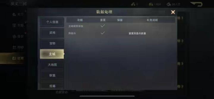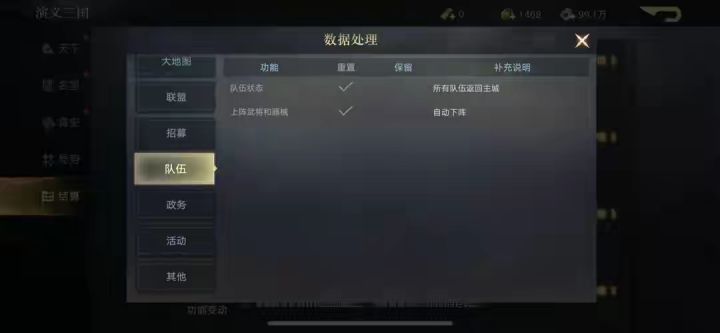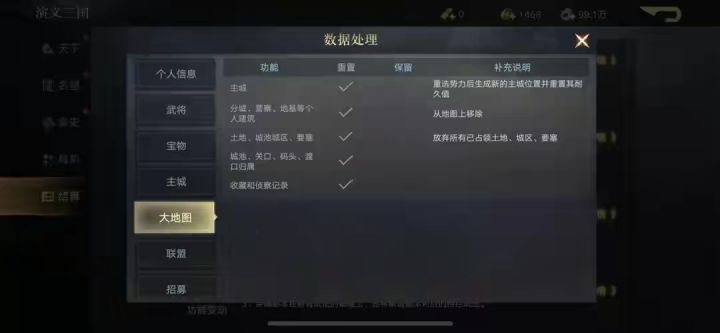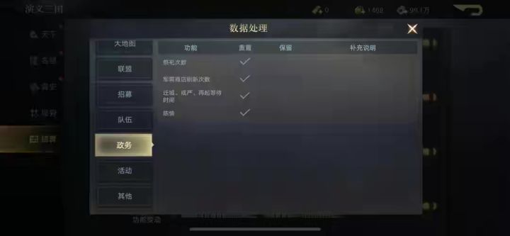 主城、大地图、联盟、队伍、招募状态、政务等均会重置,毕竟新赛季新起点,一切都是新的开始,这个阶段也不需要在这些内容上可以放缓一下进度,有更多的时间可以总结下之前的经验,让自己在下赛季少走一些弯路,同时也能总结出一些高效开荒的方式用于下赛季。