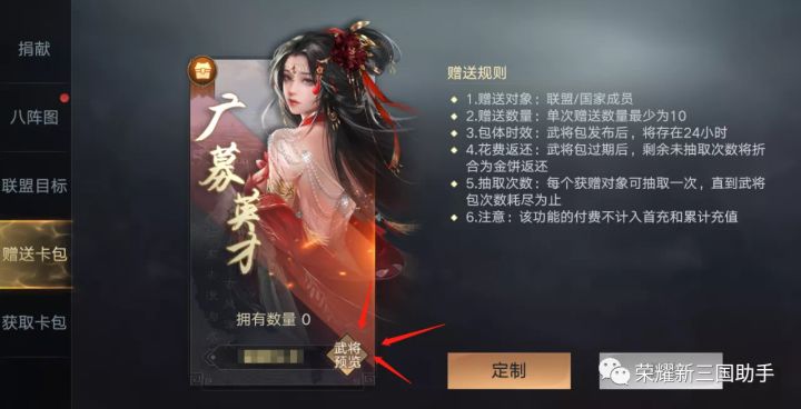 卡包&现金联盟卡包选项①这个选项卡包内容,可以在联盟---活动---赠送卡包---武将预览查看。②其本质就是联盟版广幕英才(概率,武将内容都是一样的)并且这个抽将保底是跟广幕英才共享的,也就是说如果你下次广幕英才即将触发橙将保底,那你现在去抽联盟卡包也是必出橙。③一千个卡包也是由盟主自由分配的,不是平均分④跟普通抽卡唯一的区别就是联盟卡包抽出来的会有定制的标志。联盟卡包选项①这个选项卡包内容,可