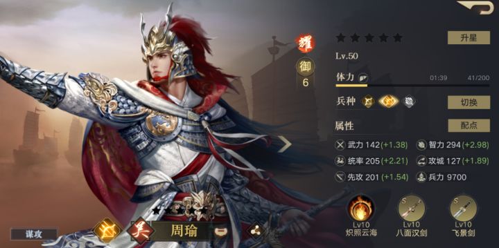 周瑜作为S1强力的法术输出核心,很多人有,但是交战时候周瑜表现很差。主要原因就是周瑜是AOE每个人刮一下。正所谓伤其十指不如断其一指。这也是为什么四骑如此强力的原因。那么如何利用仓库里的周瑜是大部分普通玩家的疑问。此贴介绍了单核周瑜的可行性。1、自带200速不需要点先攻就是优秀的先手。智力点满后高达294高超的面板保证了周瑜的伤害兜底。兵种推荐射声士+如臂使指。要的就是高增伤。周瑜的技能68