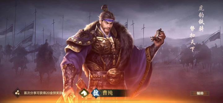 武将形象及主技能:武将自拆宝物展示:武将搭配思路:魏*曹纯是魏国骑兵的核心辅助,其技能给全体魏势力角色普攻伤害加成45%,持续全场。还能使自身及1支友方魏势力骑兵以伏兵状态潜伏在敌方后侧,持续7.5秒,处于伏兵状态的部队还能获得全局免疫内讧效果,潜伏期间还能获得伤害减免30%(受统率影响),不过无法移动,普攻,释放主动技能。潜伏结束还能立即对3支敌方造成一次普攻伤害(600%伤害率,受武力影