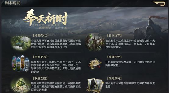 荣耀新三国不知不觉间就马上到达S6赛季了,现在马上就能报名S6赛季了,今天我们就来看看S6赛季又有什么更新的吧S6赛季——奉天祈时1、地图变化2、召义之军3、四季更易——新增季节变更,新增天气时间“泥泞”。不同季节将会带来不同加成,并会影响天气,导致不同天气的事件的产生,影响土地及通路的状态。4、典藏宝物5、联盟立国6、限定武将7、剧本结算8、沙场称王——武将与土地及城池守军战斗
