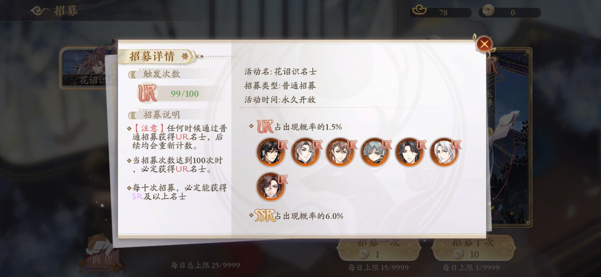 今天是内测最后一天。游戏还是很好玩的,就是战斗系统有些无聊,希望可以添加跳过。小游戏的卡通形象非常可爱,萌萌哒,爱了爱了!部分立绘超级喜欢,比如玉泽与未央,太美啦!可惜的是太过非酋,与玉泽无缘。。。嗯,说到非酋,无言吐糟,附上截图,真正的百抽保底。。。😞😞😞
