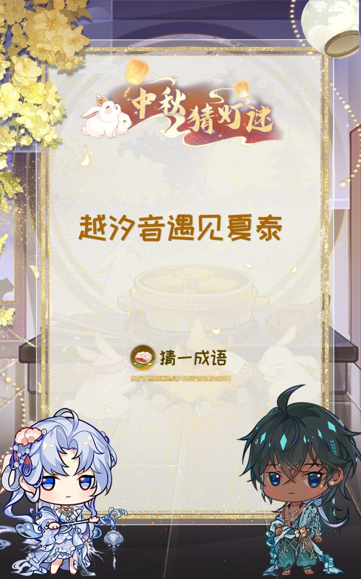 咕噜噜,咕噜噜(子叶带来今天的谜题啦!)今天的谜题是:越汐音遇见夏泰咕噜咕噜咕噜~咕噜咕噜~(学子们觉得这次中秋佳节的相遇,最适合哪个成语呢?) 咕噜咕噜咕噜咕噜咕噜咕噜!(欢迎学子们在评论区积极参与评论!) >>>【将门新月】版本活动仍在进行中,更多精彩玩法等待学子体验~ #花亦山心之月 #花果山捞月亮