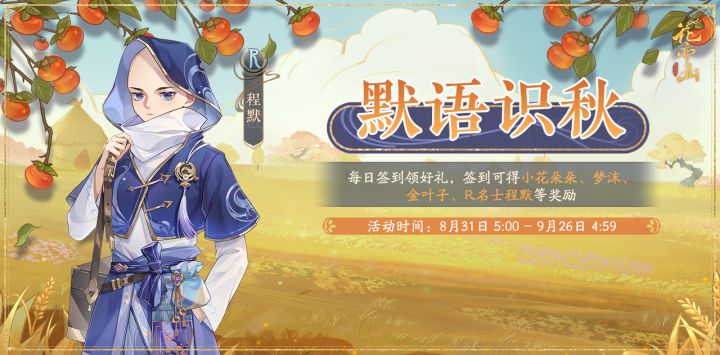 解落秋叶,默而识之。——“宣京的秋日很干燥,你来时可以多备些水囊。”🌼签到免费获取全新R卡名士程默!活动时间:8月31日 5:00 - 9月26日 4:59活动说明:每日签到领好礼,累计签到可领取小花朵朵、梦沫、金叶子、R名士程默等奖励