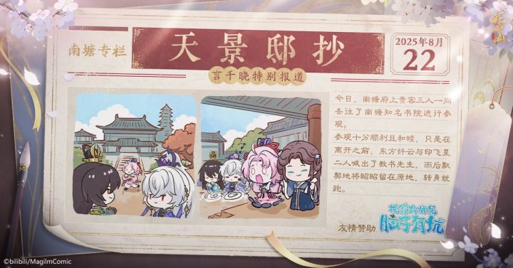听闻近日妖气四散,不止是南塘的动物植物,就连远在华清的元鸿都送来了信件,文司宥也不知为何一言不发地回到了越阳……大景究竟都发生了什么?自知带来了异变的东方纤云和印飞星毅然坐上马车,解决大景诸地乱象。 活动时间:2025年8月27日至2025年9月11日。活动详情:东方纤云和印飞星为了解决大景四散的妖气而坐上马车,马车会沿路停靠在各座府城。学子可以跟随二人的视角,观看各名士身上都发生了怎样的
