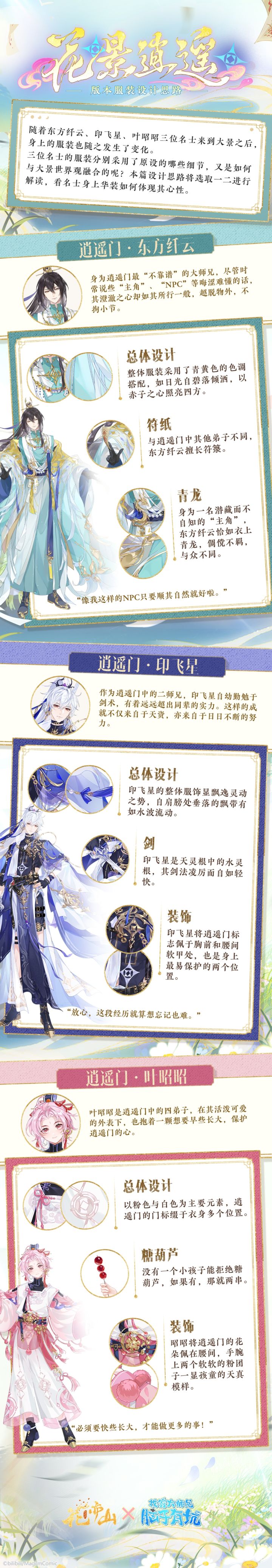 天外灵州,逍遥一梦。《花亦山心之月》×《我家大师兄》系列IP联动特别主题活动「花景逍遥」已开启,东方纤云、印飞星和叶昭昭三位名士的衣服,也随着系统的摸鱼,而发生了缜密的诸多变化。不知学子们有没有在这些变化中,找到一些熟悉的元素?本篇设计思路将选取一二进行解读,看名士身上华装如何体现其心性特质。 >>>【花景逍遥】版本活动仍在进行中,更多精彩玩法等待学子体验~#花亦山心之月 #花景逍遥#花亦山X我家大师兄系列IP联动