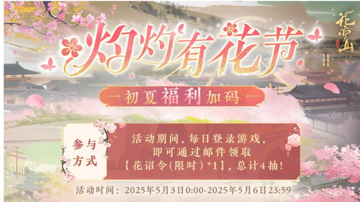 🌺时值有花节,规模宏阔,气象万千。新帝宣照亲临盛会,但见繁花似锦,群芳竞艳,一派盛景。此乃国运昌隆、盛世祥瑞之兆,遂降恩旨命院司送来初夏福利加码——即日起连续登录四天,每天领取【花诏令(限时)*1】!活动时间:2025年5月3日0:00-2025年5月6日23:59参与方式:活动期间,每日登录游戏,即可通过邮件领取【花诏令(限时)*1】,总计4抽!*每封邮件有效期持续5天*奖励每日0:0