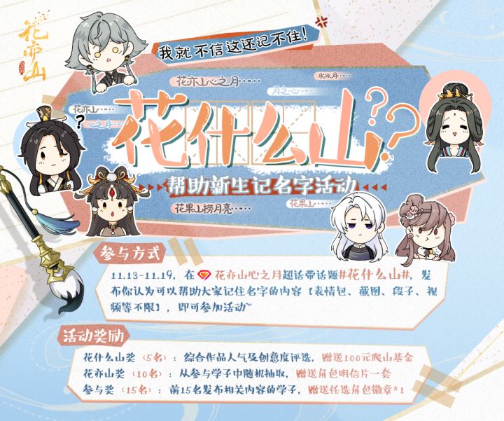 开学在即,让我看看还有哪些学子没有记住游戏名字(手动狗头.jpg)没关系,为了帮助新老同砚共记名字,我们决定开启名字活动第二弹!欢迎大家用自己的方式帮助大家加深对名字的印象!⭐【参与方式】11.13-11.19,在#花亦山心之月[超话]# 带话题#花什么山# (划重点是超话!!!),发布你认为可以帮助大家记住名字的内容【表情包、截图、段子、视频等不限】,即可参加活动~本次活动参与形式不限