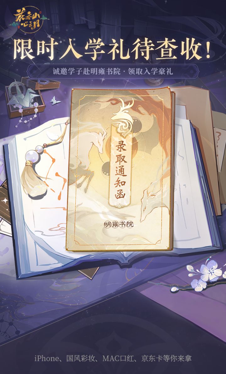 “春山门启,万景纳新。诚邀学子赴明雍书院,持刻名玉牌入学。同诵圣贤,雅行正道。”书院为你准备了丰厚的入学礼(iPhone、国风彩妆、MAC口红、定制周边礼盒等),快邀请同砚一起领取吧!传送门: flower.nvsgames.cn/zslb/h5/?from_source=weiboPS:请更多同砚可提升中奖概率唷~