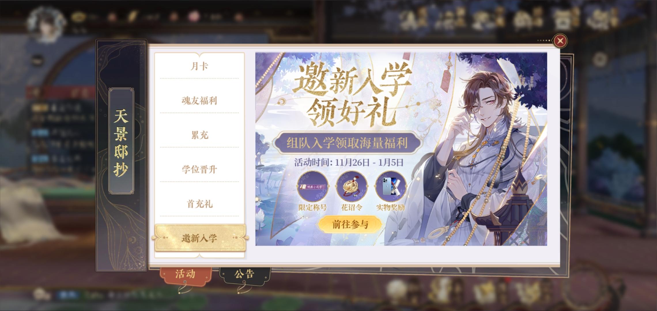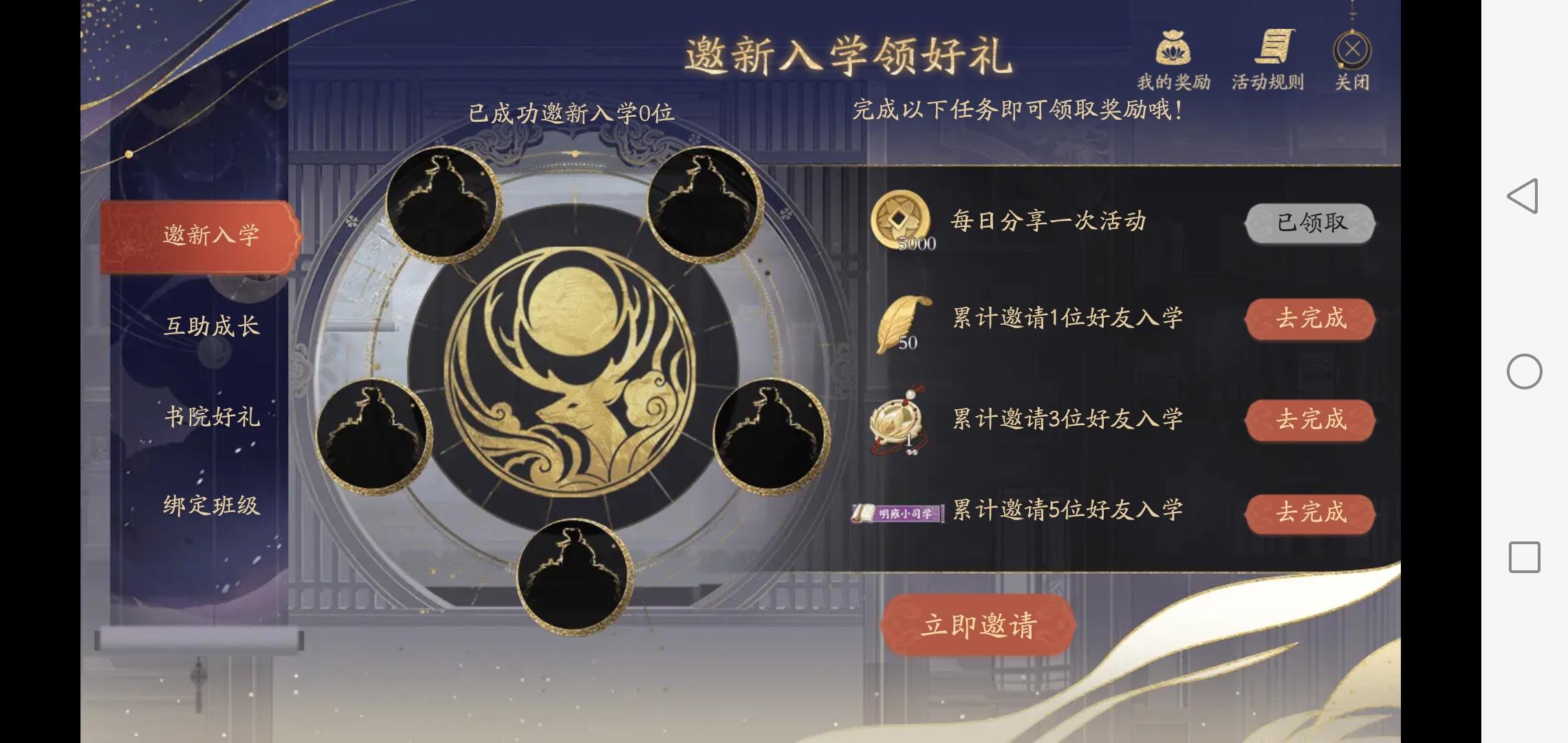 现在还有贴贴做这个任务吗555懒癌最后一天才想起,以下是我的邀请链接入学明雍书院领好礼,一起来玩高颜值国风书院养成手游《花亦山心之月》,赢取iPhone13pro及花西子口红好礼吧!https://act.snssdk.com/ugg/6176579142c01b25?invite_token=1hg4dxoj8h2io&game=flower