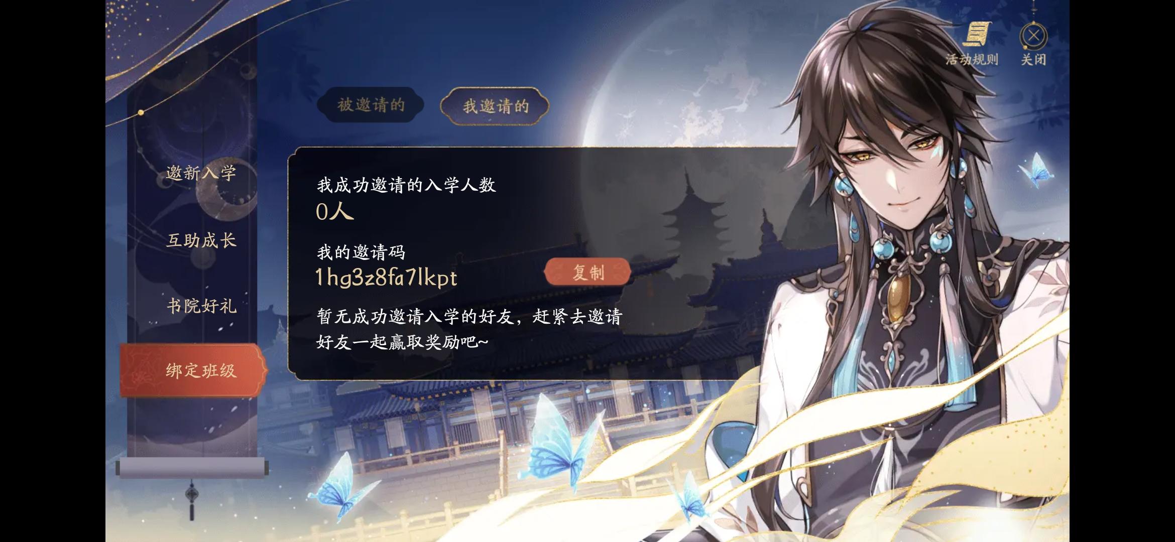 邀请码:1hg3u5leevzfs 加入班级入学明雍书院领好礼,一起来玩高颜值国风书院养成手游《花亦山心之月》,赢取iPhone13pro及花西子口红好礼吧!https://act.snssdk.com/ugg/6176579142c01b25?invite_token=1hg3u5leevzfs&game=flower