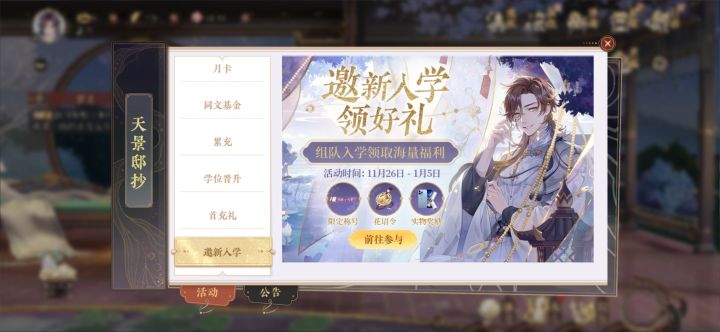 入学明雍书院领好礼,一起来玩高颜值国风书院养成手游《花亦山心之月》,赢取iPhone13pro及花西子口红好礼吧!https://act.snssdk.com/ugg/6176579142c01b25?invite_token=1hg2tc6vrb31c&game=flower