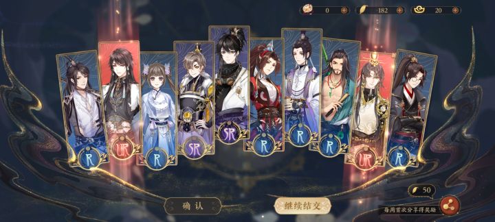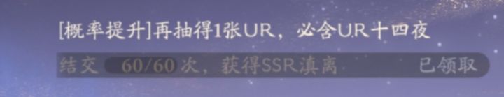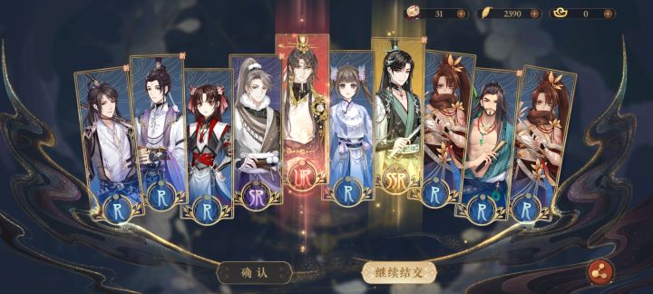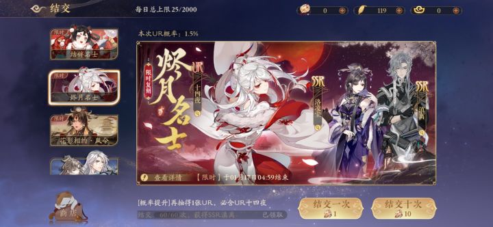 40连里面出了2个SSR、3个UR。前面两次10连抽,每次都会有一个SSR。第3次10连出了宣望钧的UR(但是之前已经有了)第4次10连,由于之前抽到UR和SSR了,保底数都清零了,所以我已经做好了只有sr的心理准备,结果出了个双黄蛋!!!其中还包括我想要的新UR!!谁懂啊家人们!!好兴奋!!#花亦山心之月