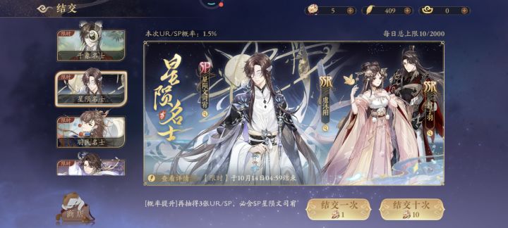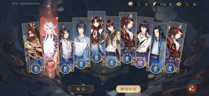 当初星陨文思宥活动出来的时候我正好没玩,所以当时没有拿到,今天发现SP就差他一个了,想着干脆抽一下,前面才垫了6抽,没想到一个10连就出来了,现在SP也圆满了,舒服~