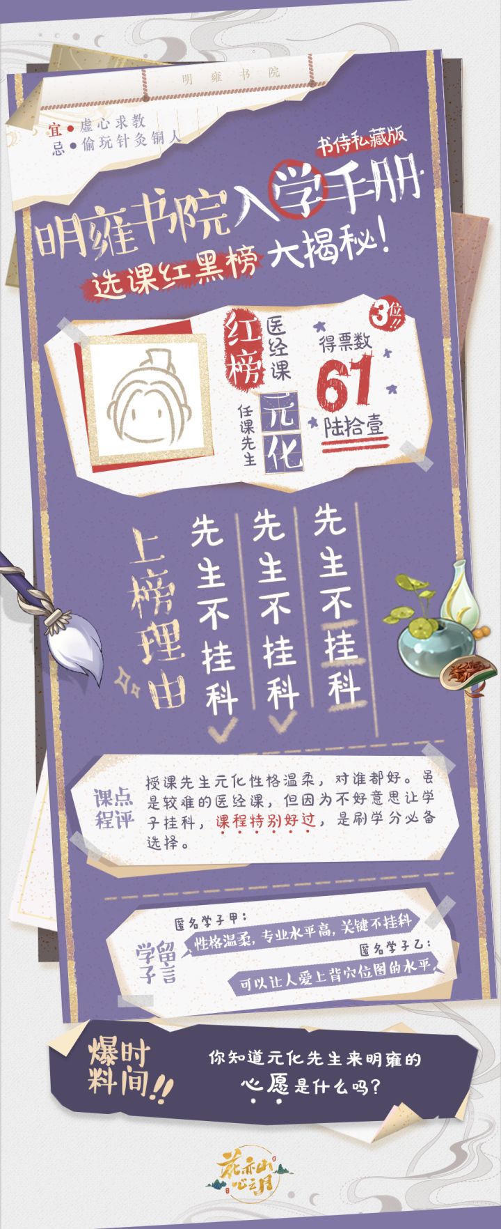 元化先生的课高居选课红榜第三,要说得票这么多的原因,“不挂科”三个字涵盖了一切(手动狗头.jpg)提起医经课,你知道元化先生来明雍的心愿是什么吗?*选课红黑榜大揭秘每周三、周五18:00更新,欢迎吃瓜
