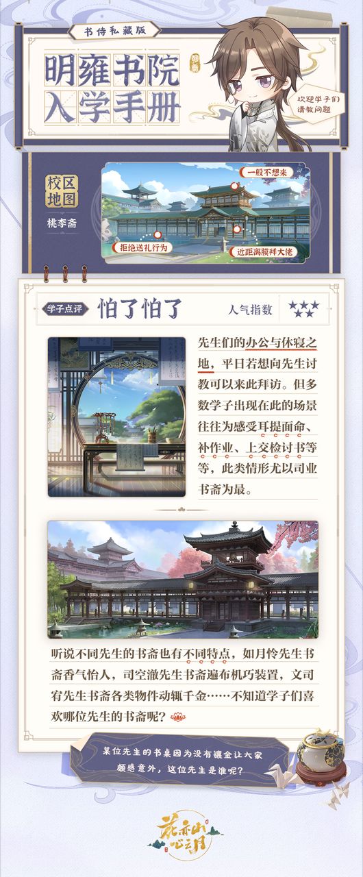 锵锵锵!为更好指引各位学子的书院生活,子花特意准备了珍藏版的入学手册和大家分享~第一期是关于校区地图之学堂篇,这里是每位学子必打卡之地,虽四面敞亮风光甚好,但开小差时也很容易被巡查的陈司业逮住记上一笔( ˊ•̥▵•)੭₎₎听说某位先生曾被发现下课留下的杯子里是珍珠奶茶,你知道是谁吗?