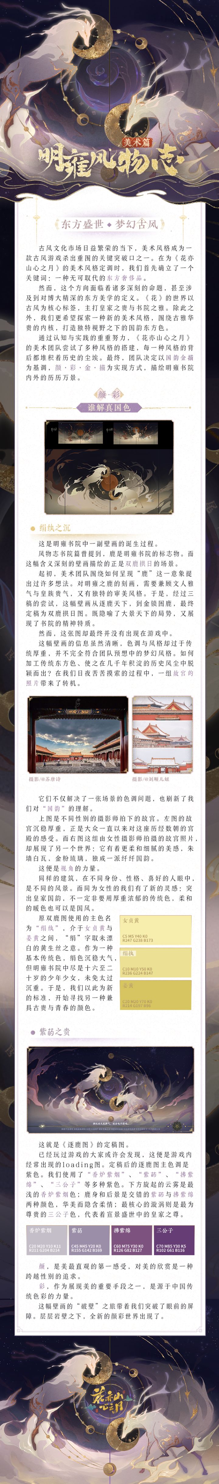 ——要做好国风音乐的创作和传达,这对我们以及这部作品非常重要。创作早期,我们基于对音乐的理解,确定了这样一个看似具体但又很模糊的目标。从“华音雅颂”到“华音雅韵”,我们展开了一系列关于音乐的探索。如何结合景朝东方盛世的世界观背景,如何融合典雅古韵与现代音乐审美?登录曲怎样减少大家的疲劳感,角色曲怎样平衡人物性格与乐器特征,书院主题曲怎样展现明雍的风貌……每一首曲子背后,都是一个个反复琢磨