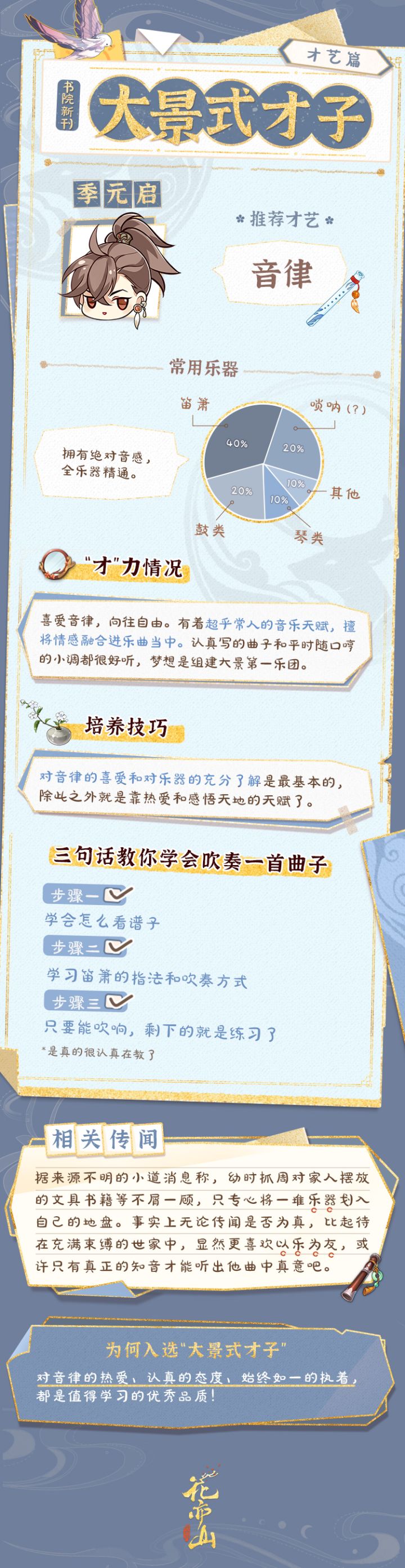 能够靠才艺被称为“才子”,除天赋之外,长期的坚持和努力也很重要。幼时至今始终热爱音乐,被部分明雍学子称赞为“作曲你可以永远相信季元启”的季大少爷正是如此。虽然常被称为天才,有着与生俱来的绝对音感。但每一段悠扬乐声背后,其付出也是常人所不知的。PS:据说上树和摸鱼都是寻找灵感不能算偷懒(手动狗头.jpg)