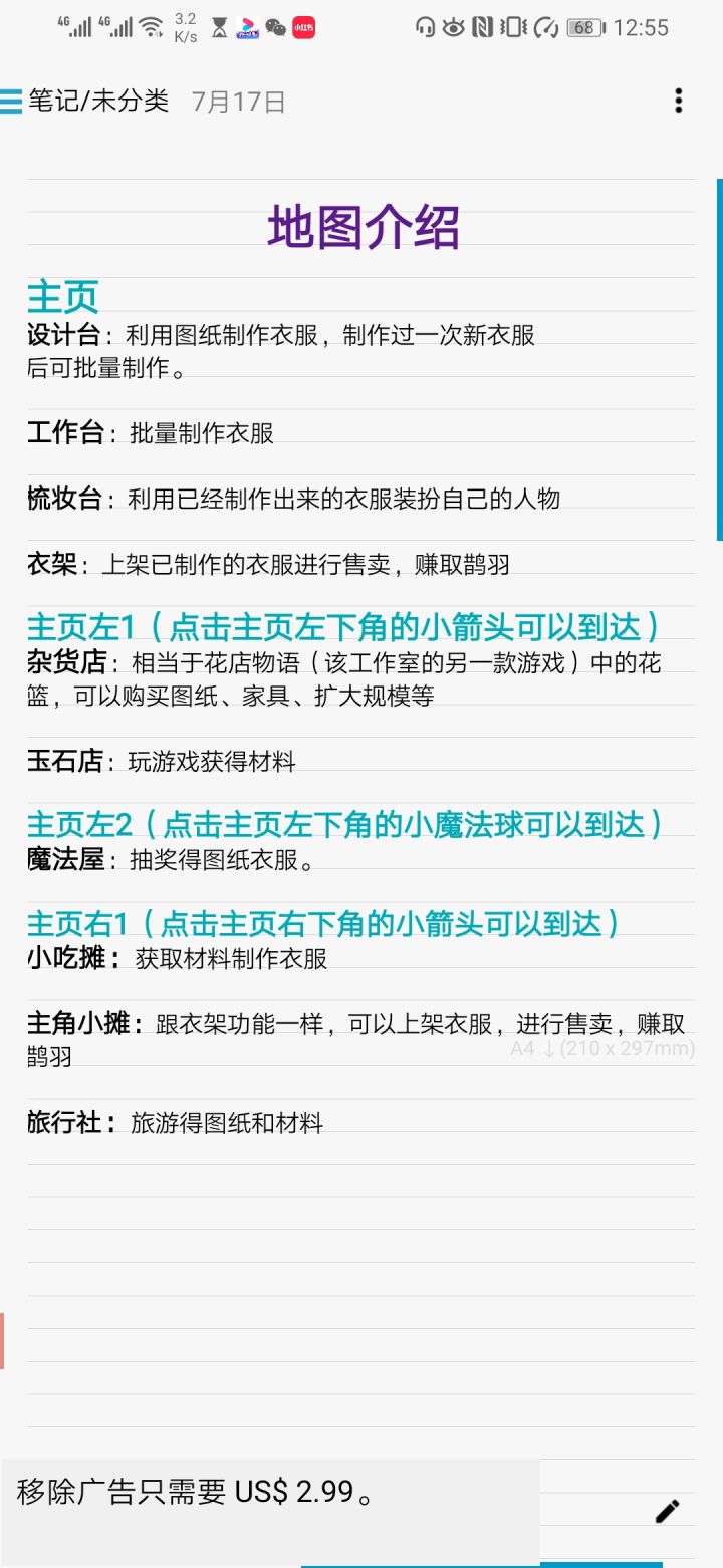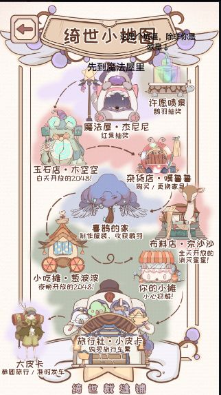 主界面①喜鹊的家👇🏻喜鹊之树👉🏻可生产鹊羽(通用货币)2.5小时生产一次,可看广告,一日五次,广告有间隔。②设计台 获得的设计图在此进行制作,解锁图鉴。③如何获取设计图杂货店购买(左边图)以主界面为基准魔法屋抽奖(左边的左边)旅行社旅行(右边图)④工作台在设计台解锁了的服装,可在此进行批量制作 (点服装下面的+号)材料要充足才可批量制作⑤梳妆台主角换装(解锁的服装才可以穿哦