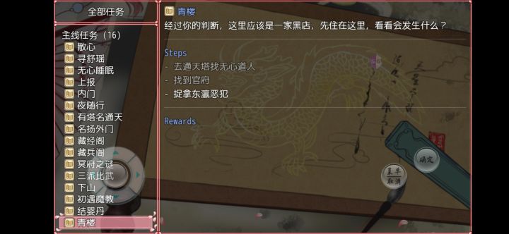 由于之前没想过做缘楼的攻略,也没有之前的档,所以攻略里的图是没有缘楼出现的,大家将就一下吧。1.搭讪缘楼大概是图的位置有个闪光点,互动,剧情结束后记得拿上伞,接下来就可以回头找缘楼了回头后就会来到桃花林,对话缘楼,然后向前走继续对话缘楼2.收服坐骑先对话狼小姐,会让你去买裙子和打十颗金丹妖兽内丹裙子在凡人城的杂货铺有卖内丹有俩种方法(1).凡人城农民任务(好处,必掉)(2).枯