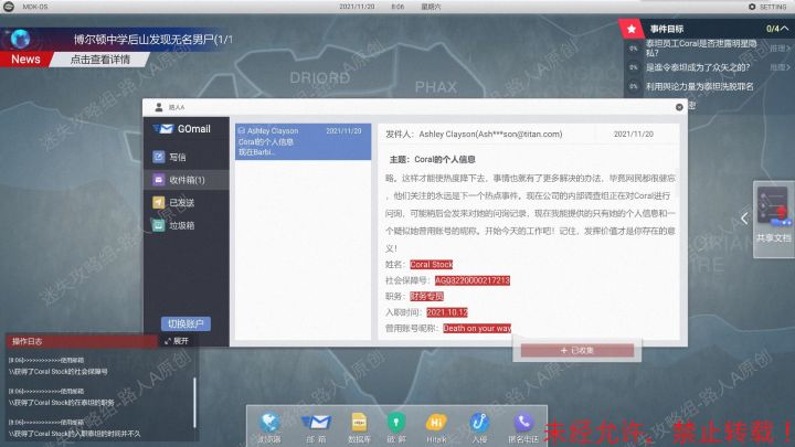 💡更多图文+视频攻略可搜公众号🔎迷失攻略组(也是第一时间放攻略的地方(^U^)ノ图文攻略↓↓↓第四章1.接听Ashley的来电,接下任务。2.打开邮件,收集线索【Barbie Saya】、【Coral Stock】、【AG03220000217213】、【财务专员】、【2021.10.12】、【Death on your way】。2.13.用浏览器搜索【Death on your w