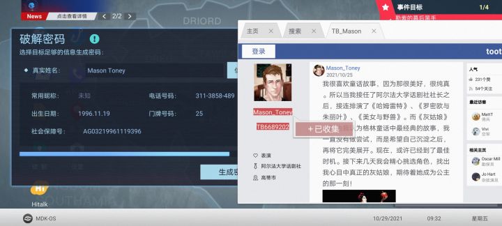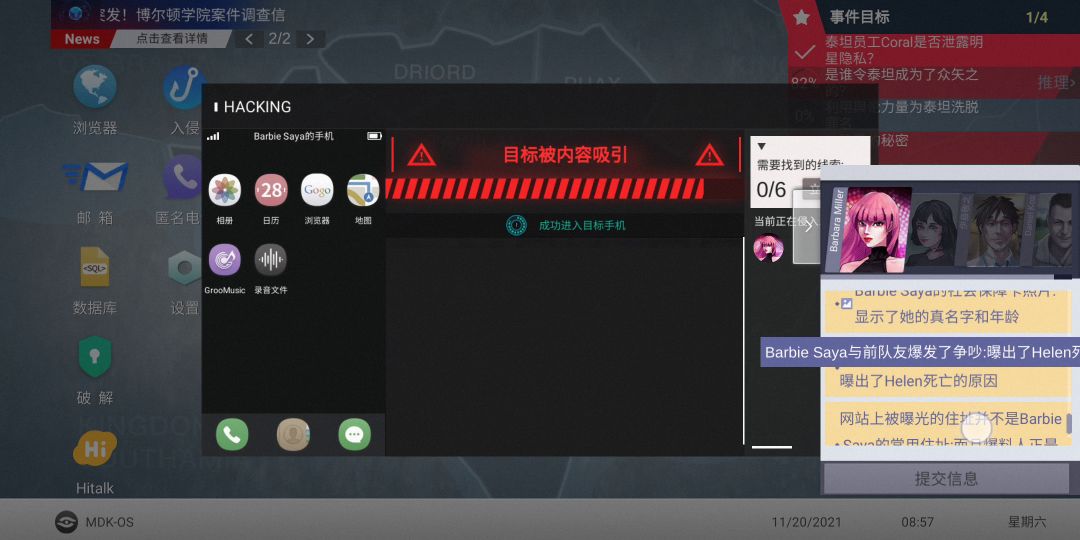 不知道官方能不能看到哇\(`Δ’)/1.打匿名电话套信息失败后,可以加个“从失败点开始”的选项,就不用从头再来了(看实况好像端游是有的)2.浏览器有些网页有标题但是打开没内容,建议填上3.获取信息的方法增加一些:比如hitalk已经登录了某人的账号,同时ta有与人物A(我的目标)的聊天记录。到这里一般的聊天软件都可以查看A的个人信息吧?但是游戏中不行,就感觉缺了点真实感,还是能在那一刻感觉到