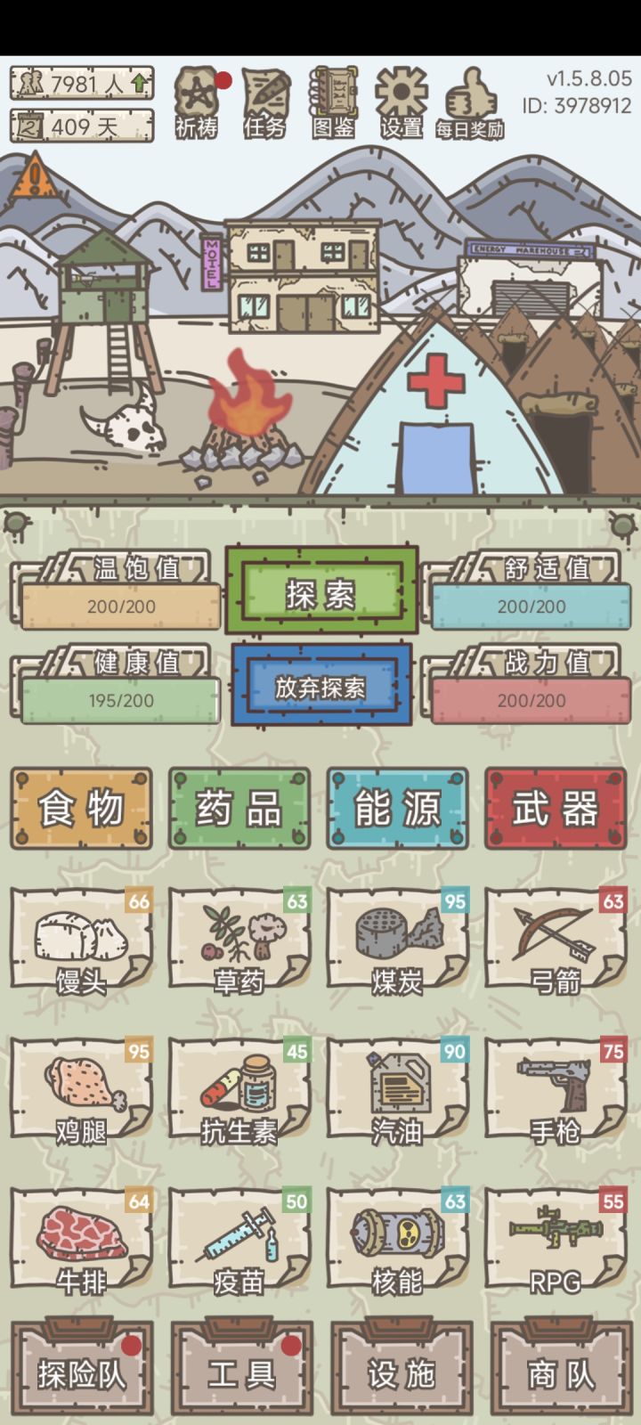 开始食6/11/7,药0/8/4,能4/23/8,武9/16/3;结束食81/44/4,药76/86/10,能19/0/0,武75/64/8;差3896。 假设每次生产耗食2.5能10,共耗3550。7446/284=26(平均产值)