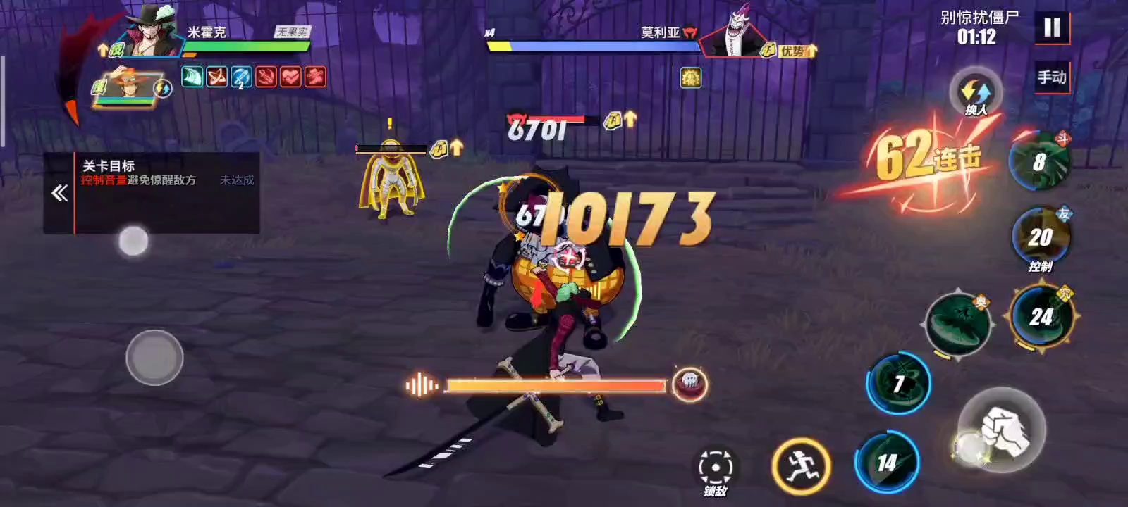 别急仔细阅读记住就明白为什么让按照我的顺序打。这一步记住先抓,不用问为什么只要你认真看了开局。空岛老头还是晕这个并用风往墙吹过去。目前操作都是为了后面索隆一个大清场做准备,每一步都按我的教程来。基本上一套操作下来他们已经聚起来了,往右上角墙角压过去。机会来了,索隆开大。这时候只剩下一两个怪了,把另一个推离医生避免受治疗并优先打死。剩下的医生打破盾后直接鳄鱼开大解决。力关卡难度最高,