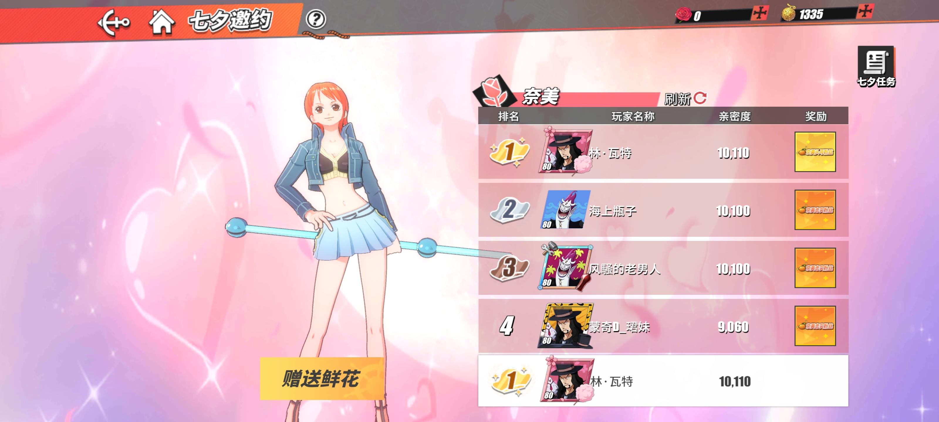 这次七夕活动有问题啊!!!送花没有的话点送花应该跳你没有该道具,然后转到购买界面。而现在点送花这就是购买界面有问题我被骗一万金果!😭😭😭😭😭😭😭那一万我还打算留着抽下一个池子了为什么我昨天中午70出了佐罗要是90我就少亏4000金果了
