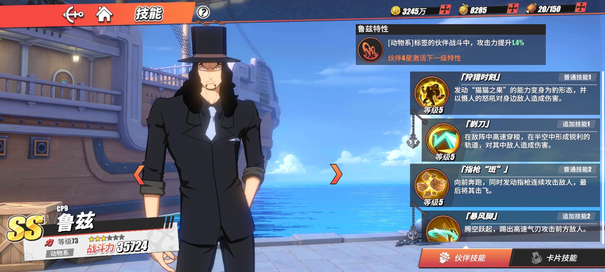 鲁兹通常连招为【指枪“斑”】+【暴风脚】+【狩猎时刻】+【指枪连击】+【剃】+【跃空击】+【猛兽爪】+【暴风脚“豹尾”】+【狩猎时刻】+【剃刀】+【六 王 枪】+【最大轮六 王 枪】,要充分利用好变身短暂霸体效果和【剃】的无敌效果来避免控制和规避伤害。激斗技【铁块】还是用在pvp比较适合,让你永远双霸体,技能不容易被打断,合理反打能力。在pve碰到盾较厚的敌方角色时,友情技应带控制技能,让鲁兹更好打出连招,鲁兹只有【猛兽爪】是抓取控制,而且要提前把连招打出才会出现这个追加技能,所以用控制技能的友情技配合最好。欢迎大家指正,谴责盗图盗字的同学。安卓区服1147奇妙伙伴,昵称小汤姆,账号1flgv27018bll