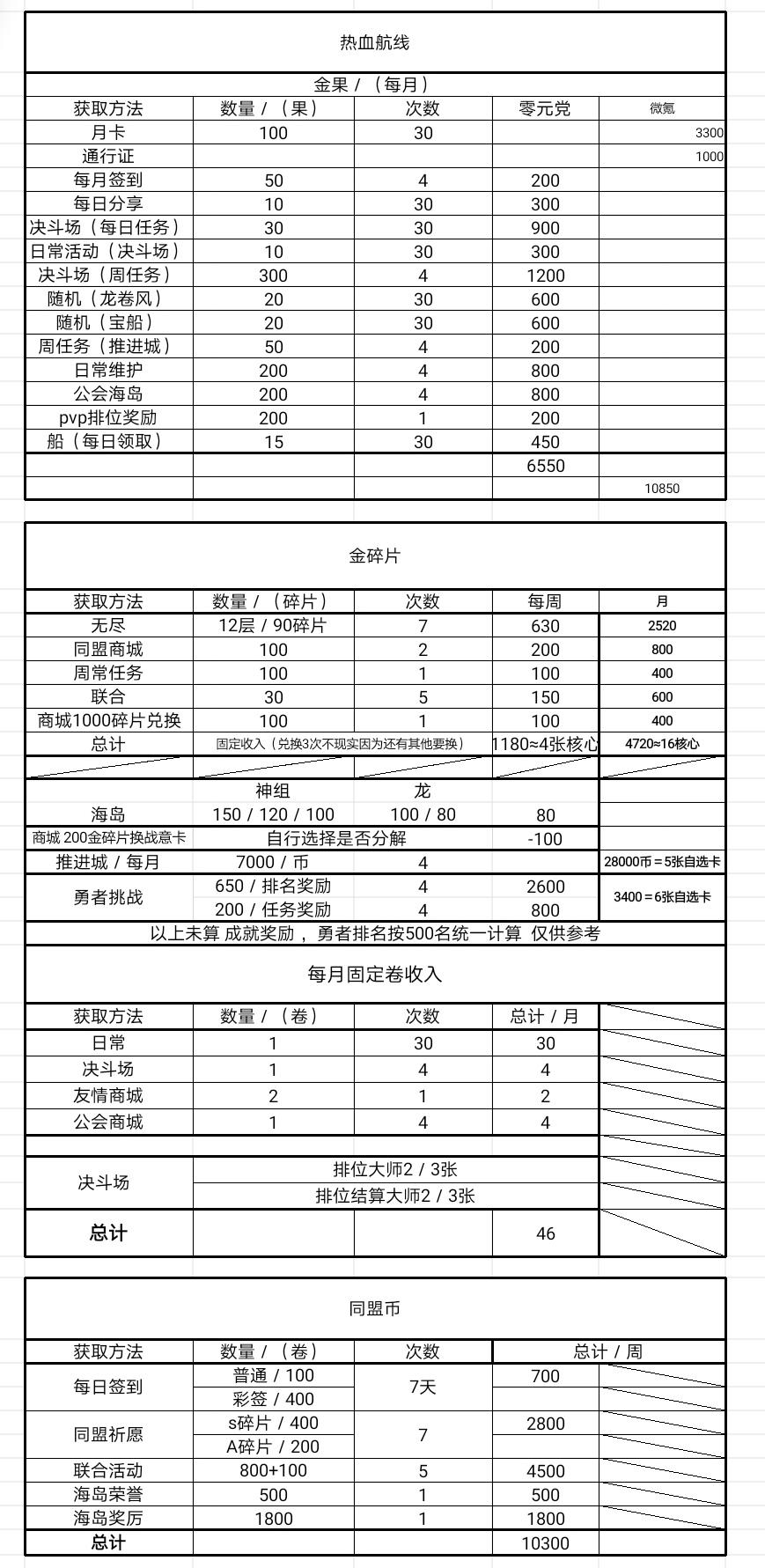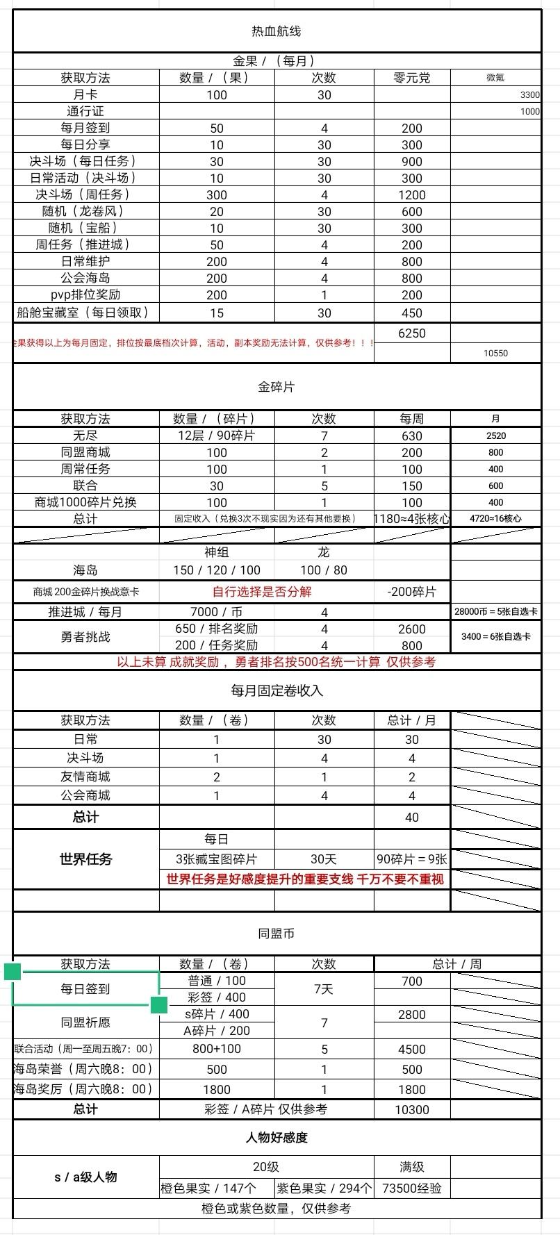 其实这个游戏金卡很容易获得。每天强敌降临去混或者抢排名可以拿1—3张抽卡。后期打无尽探险十二,可以每天拿45个碎片加强敌每天稳定五连抽。不算签到活动这些送的和商店兑换。每月就有150个卡劵。虽然卡片没有保底。卡片商店每星期可以兑换两个箱子其中一个是必出战意的。另一个也会出。但是出什么垃圾的激斗奥义就拆掉 那前期没有一套的话可以二金卡配一张紫卡。或者一金两紫,最好是有一号位。如果凑齐一套的话可以全角色混用。虽然不同属性没有套装加成。但是比紫卡厉害多了.通用卡不建议养,可以过度一下 核心不想花钱买周卡的话,每天联合,好感养成到二十拆两张,船舱升级后任务这些送的食材很多的,养到二十很快的,盟商店后面会出三百个黄星。周任务一百个,进到好一点的盟周六海岛还可以拿一些奖励 建议小氪买一段时间的周卡 建议金果都留着抽人物