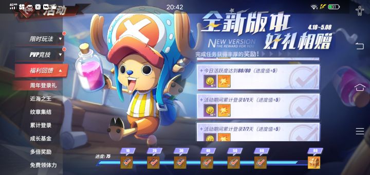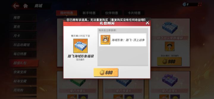 更新后一堆bug。这个重聚香波地,周年庆开始之前就有,我获得了路飞的体验海域形象,现在商店卖永久的我不能买。而且我不理解活动得限时的,商店卖永久的,我不知道活动的意义在哪?#bug反馈